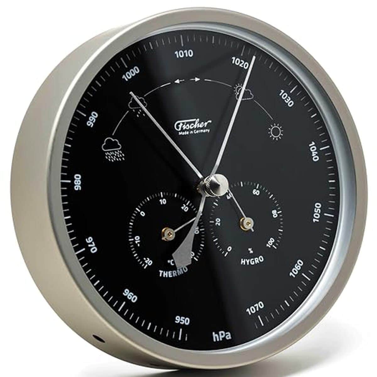 • Fischer 1602-01.06 - Station météo extérieure - Thermomètre 160 mm - Baromètre, hygromètre - Acier inoxydable - Cadran noir - Fabriqué en Allemagne