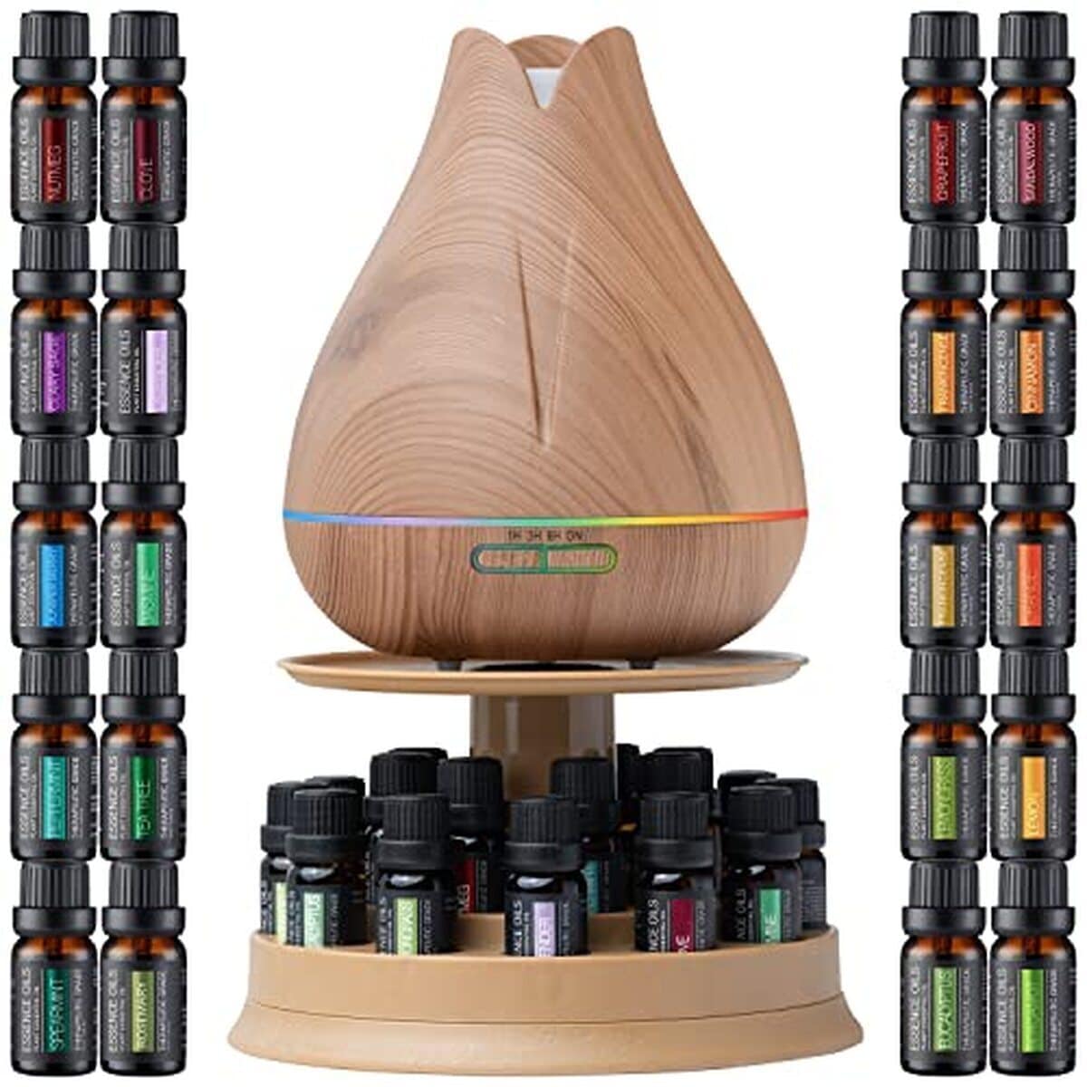 Diffuseur ultrasonique ultime pour aromathérapieLe lot complet – Notre diffuseur Essence a une capacité de 400 ml et utilise une technologie de diffusion par ondes de pointe pour atomiser les huiles essentielles pour un bien-être ultime. Le diffuseur Essence comprend 7 modes de lumière ambiante avec deux réglages d'intensité pour 14 combinaisons de lumière différentes. Il comprend également 4 réglages de minuterie et une fonction d'arrêt automatique pratique pour les niveaux d'eau faibles. Essence est fabriquée en plastique sans BPA avec un beau motif en bois de chêne clair. Support rotatif – Nous incluons ce que les autres ne peuvent pas. Un joli présentoir rotatif pratique vous permet de l'utiliser, de stocker et d'afficher votre diffuseur et huiles essentielles en un seul endroit sans avoir à les ranger séparément. Le diffuseur se trouve sur le dessus du support tandis qu'un carrousel rotatif peut stocker et afficher les 20 bouteilles d'huiles essentielles incluses. 20 huiles essentielles végétales – Nos 20 huiles incluses sont lavande, eucalyptus, arbre à thé, orange, menthe poivrée, citronnelle, jasmin, muscade, clou de girofle, menthe verte, encens, cannelle, citron, bois de santal, ylang-ylang, sauge sclarée, pamplemousse, bergamote, romarin et baies de genévrier. Résultats prouvés des formules anciennes. Nos huiles sont formulées à partir de plantes de la plus haute qualité, telles que la lavande de France, la cumine indonésienne et la camomille romaine. Nos mélanges d'huile mélangent des proportions spécifiques de nos huiles 100% pures pour créer des effets puissants sur l'esprit, le corps et le bien-être général. Nos huiles n'ont pas de remplissages ajoutés et absolument zéro additif. Il suffit d'ajouter 6 à 8 gouttes dans le réservoir d'eau pour ajouter un léger parfum à n'importe quelle pièce. Soutien 24 h basé aux États-Unis et 1 an de couverture : notre légendaire personnel de soutien basé aux États-Unis est en veille pour répondre à toutes les questions et préoccupations. Nos produits incluent également une année complète de protection – si vous rencontrez des problèmes, nous ferons le bon choix en temps opportun.198,06 €